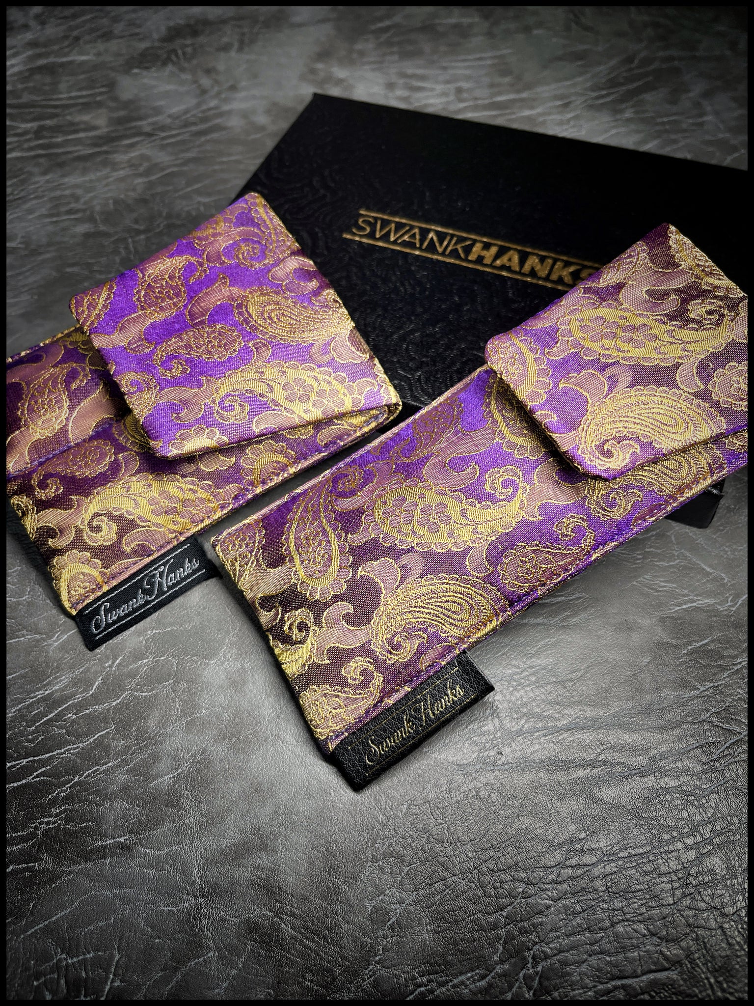Back by popular demand, this is one of our favorite variations of the highest grade quality 6A Mulberry Silk Paisley. And on the interior is a nicely matching gold silk houndstooth. Fairly limited for the time being and also available in full size single slot.