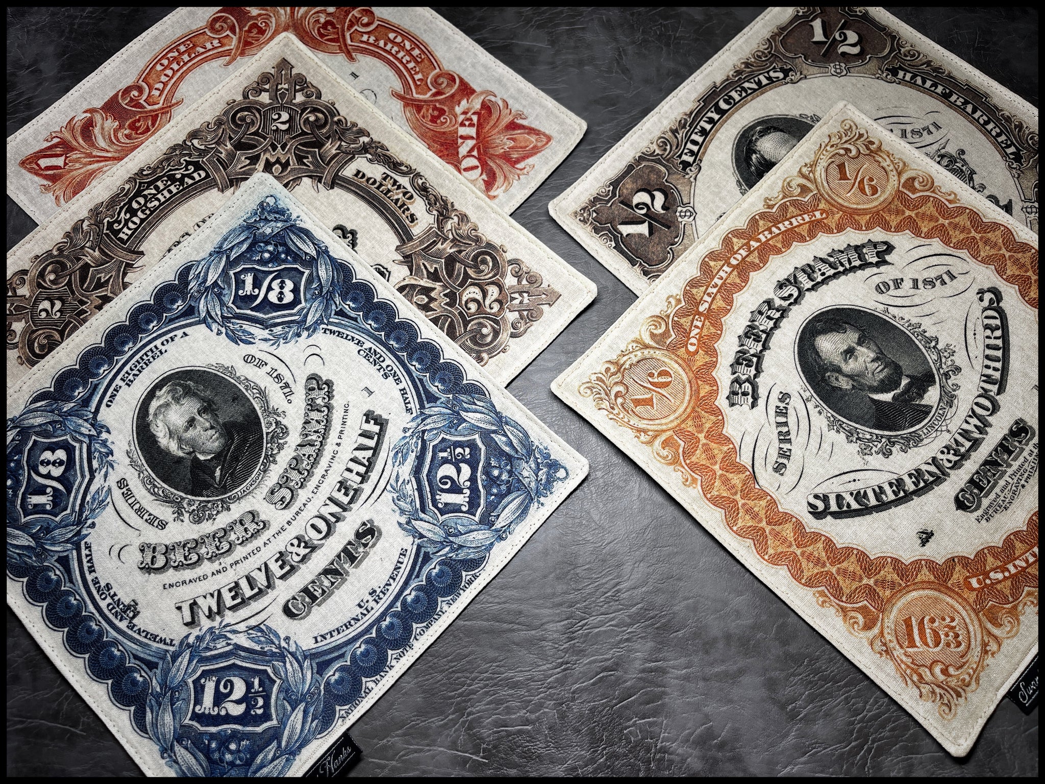 Back by popular demand, these Beer Stamp hanks were a best seller nearly a decade ago when we first started making hanks. These are made with. very nice durable linen canvas and our classic black microsuede on the back. Enjoy friends!