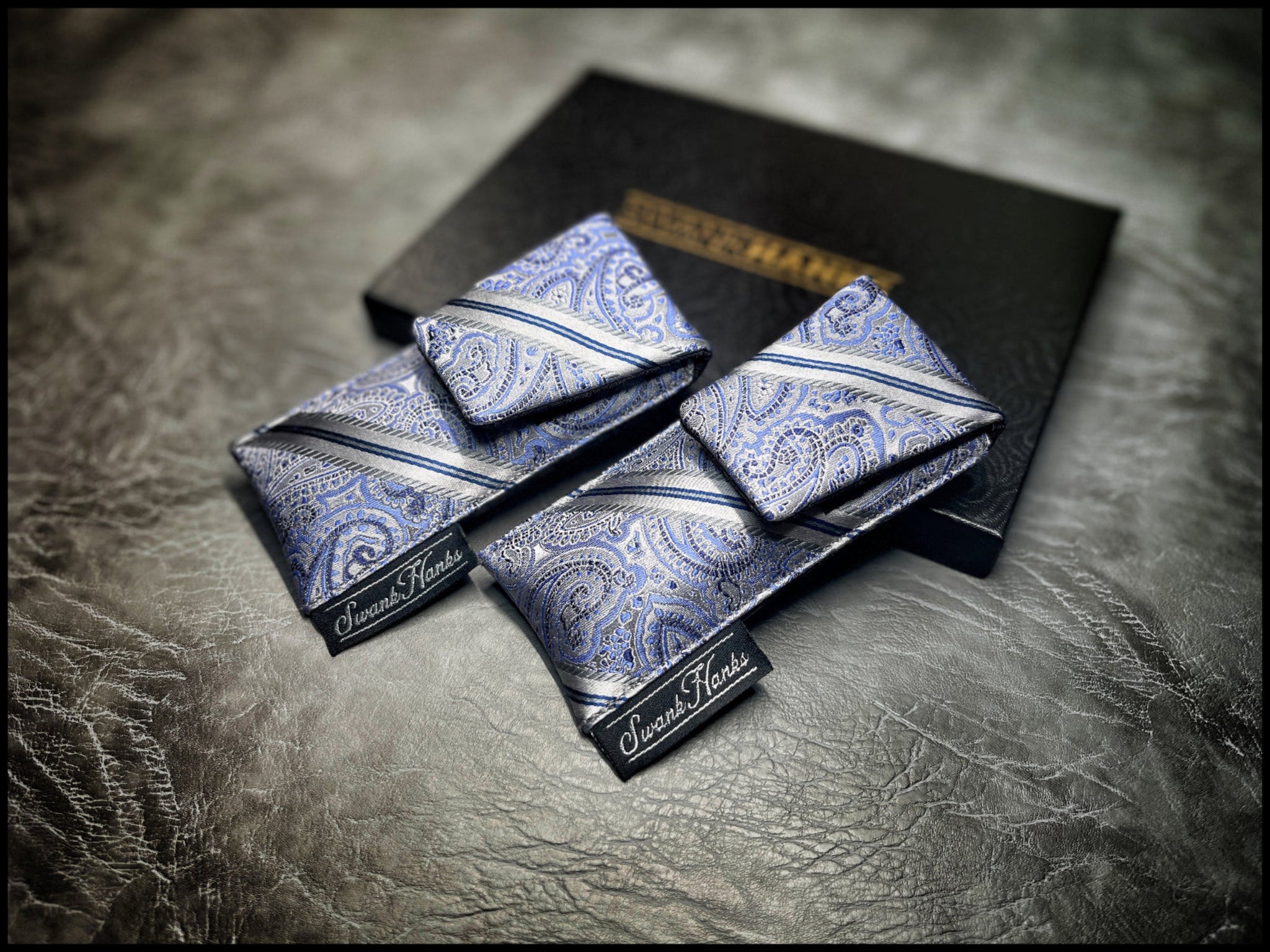 Beautifully intricate super premium pinstriped blue/silver silk on the exterior. On the interior, our popular black basketweave silk.
