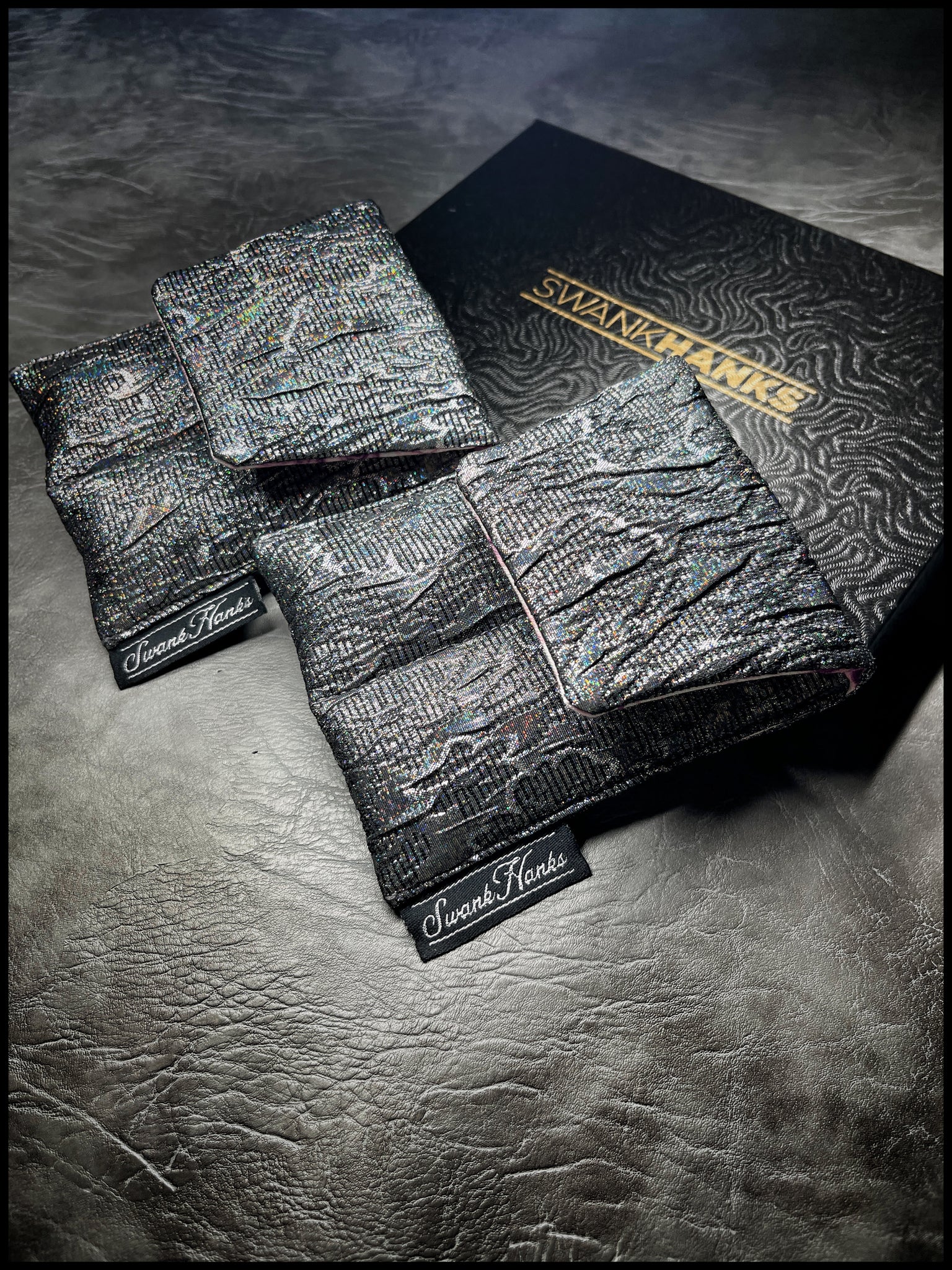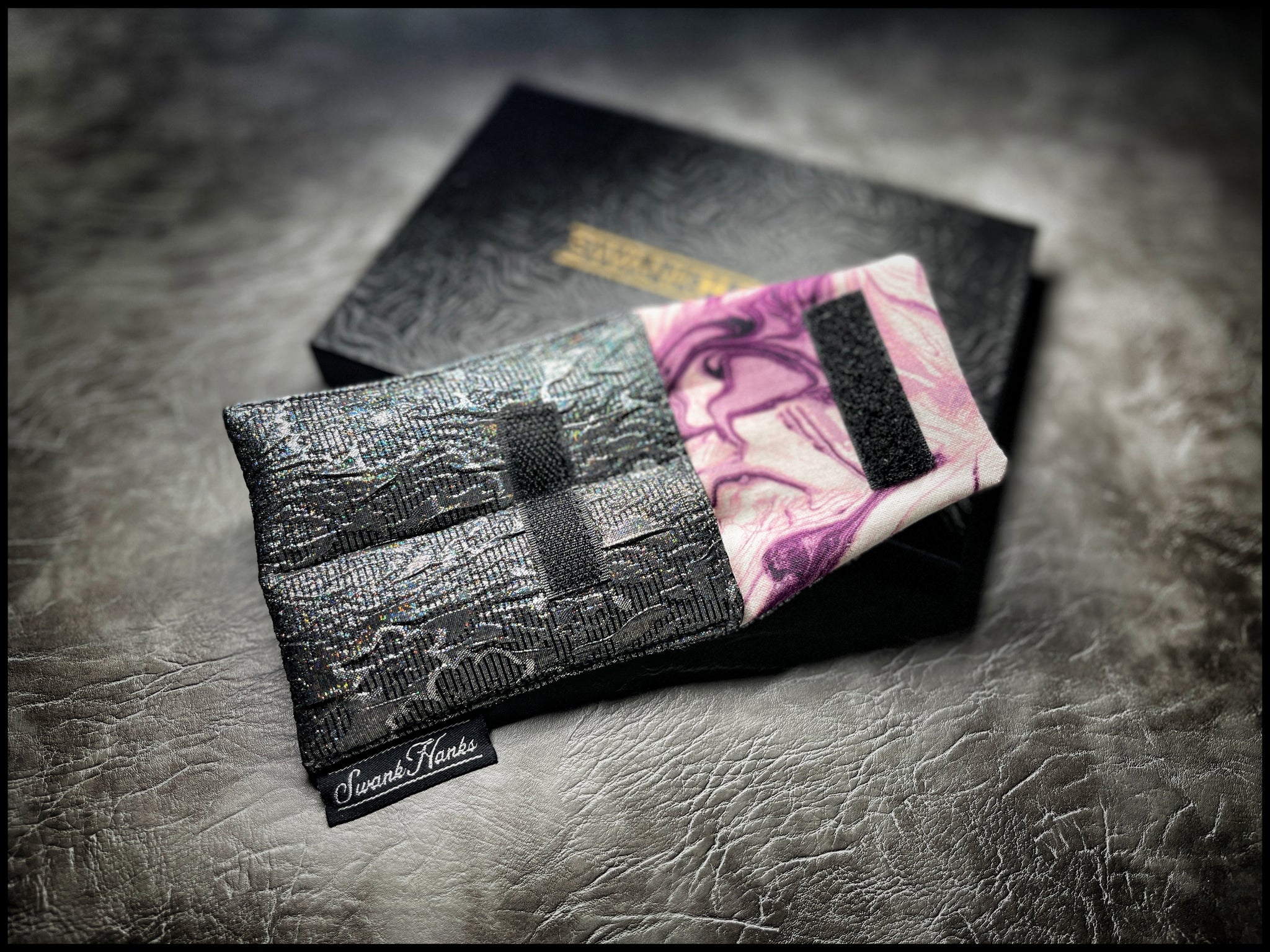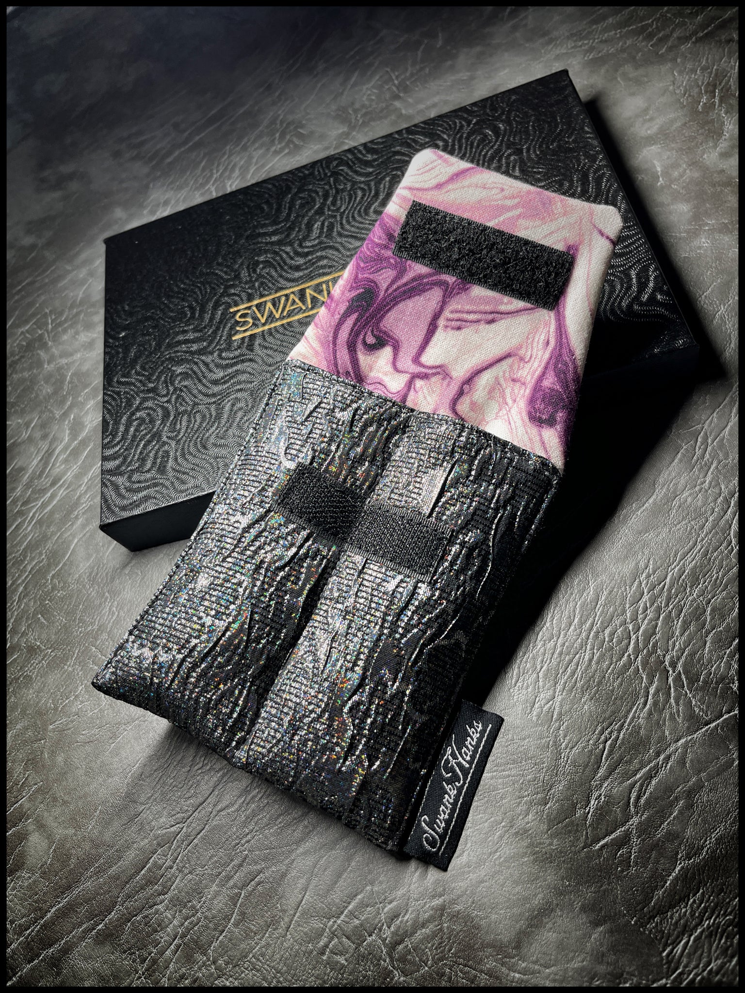 This is a design we've released in the past, but this is the first time offering it as a mini double-slot. A funky textured silver that sheen with a spectrum of colors when the light hits it. And on the interior is a funky marbled purple cotton. Very limited for the time being. Enjoy
